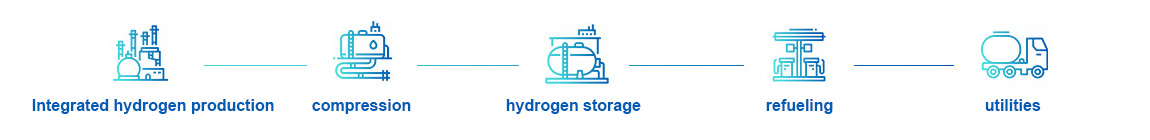 According to the resources of raw materials for hydrogen production at the site of the hydrogen refueling station, hydrogen meeting requirement of PEM fuel cells shall be produced on-site. The product hydrogen is compressed to 20MPa for primary storage, and then pressurized to 45MPa or 90MPa, and then filled into fuel cell vehicles through the hydrogenation machine; At the same time, a 20MPa long tube trailer is set at the primary storage end to provide hydrogen to other hydrogen stations, which is especially suitable for establishing an integrated hydrogen production and refueling master station in the suburbs of the city, and setting up a hydrogen sub-station in the center of the city to form a regional hydrogen master-and-sub-station.