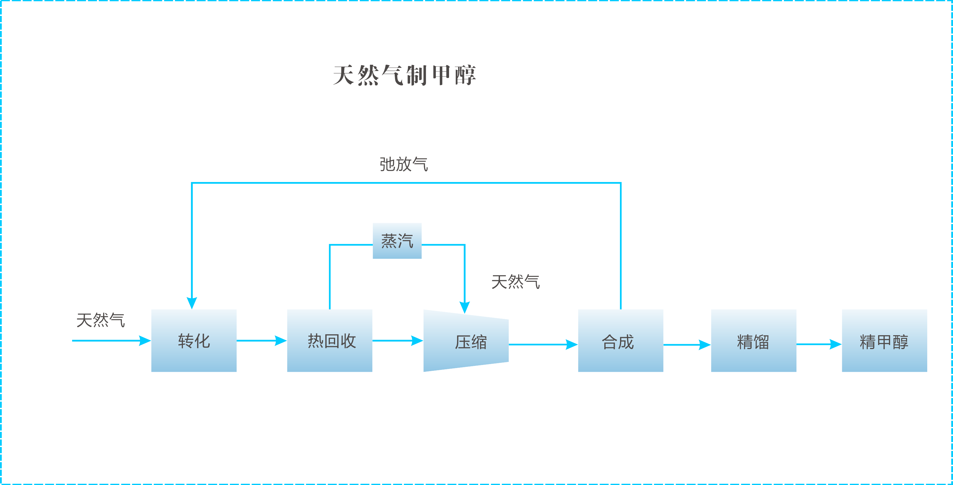工藝流程以天然氣為原料,經(jīng)壓縮、脫硫凈化、造氣得到合成氣(主要成分H2、CO),合成氣進(jìn)一步壓縮后進(jìn)入甲醇合成塔,在催化劑作用下合成甲醇。合成后的粗甲醇,經(jīng)預(yù)精餾脫除雜醇,精餾而得成品甲醇。