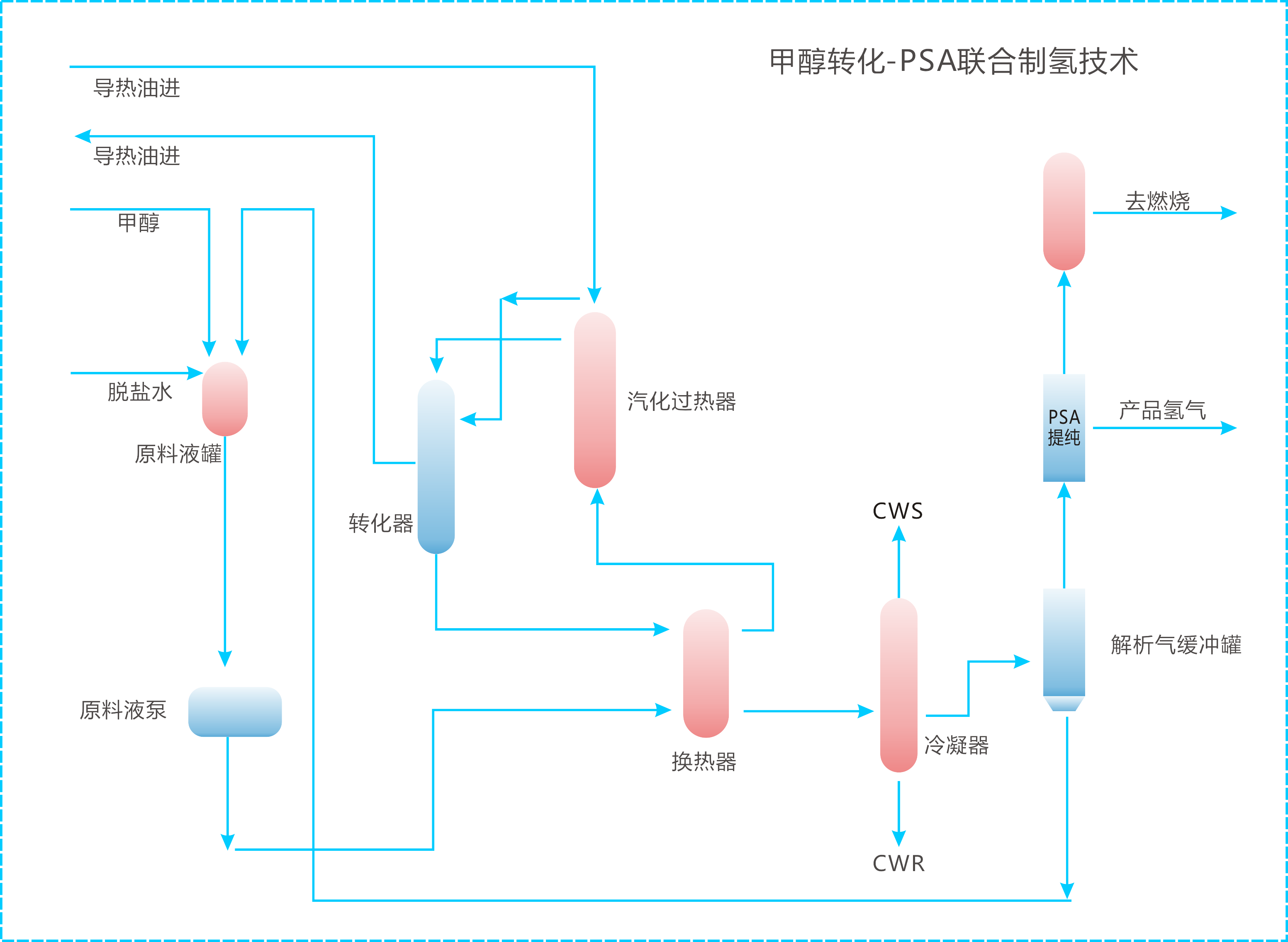 工藝流程甲醇和脫鹽水經(jīng)混合、加壓、汽化、過熱進入反應器,在催化劑作用下,反應生成H2、CO2、CO等混合氣,混合氣經(jīng)變壓吸附(PSA)分離技術(shù)一次性獲得純氫或高純氫氣