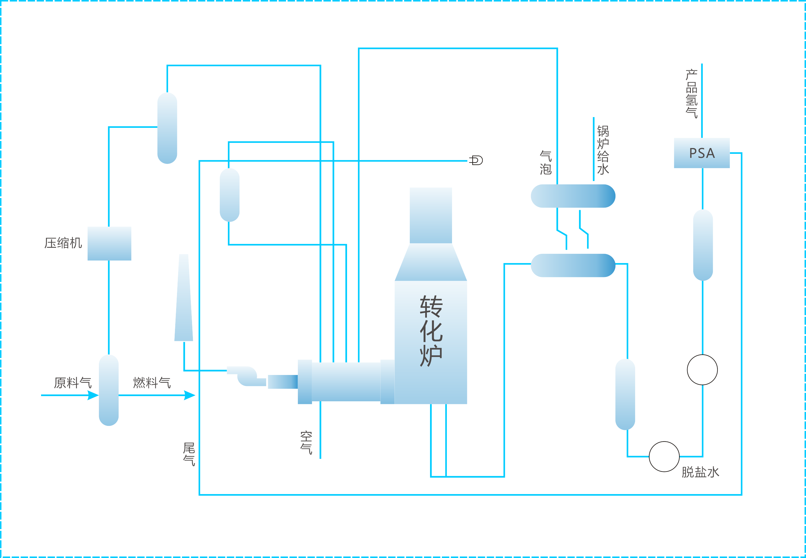 工藝流程天然氣或其它原料經(jīng)加壓脫硫后與水蒸汽混合進入特殊轉(zhuǎn)化爐,在催化劑的作用下重整反應,生成含有H2、CO2、CO等組份的轉(zhuǎn)化氣,轉(zhuǎn)化氣回收熱量后,經(jīng)變換反應將CO轉(zhuǎn)化為氫氣,變換氣再通過PSA提純得到氫氣,PSA尾氣返回轉(zhuǎn)化爐燃燒回收熱量。