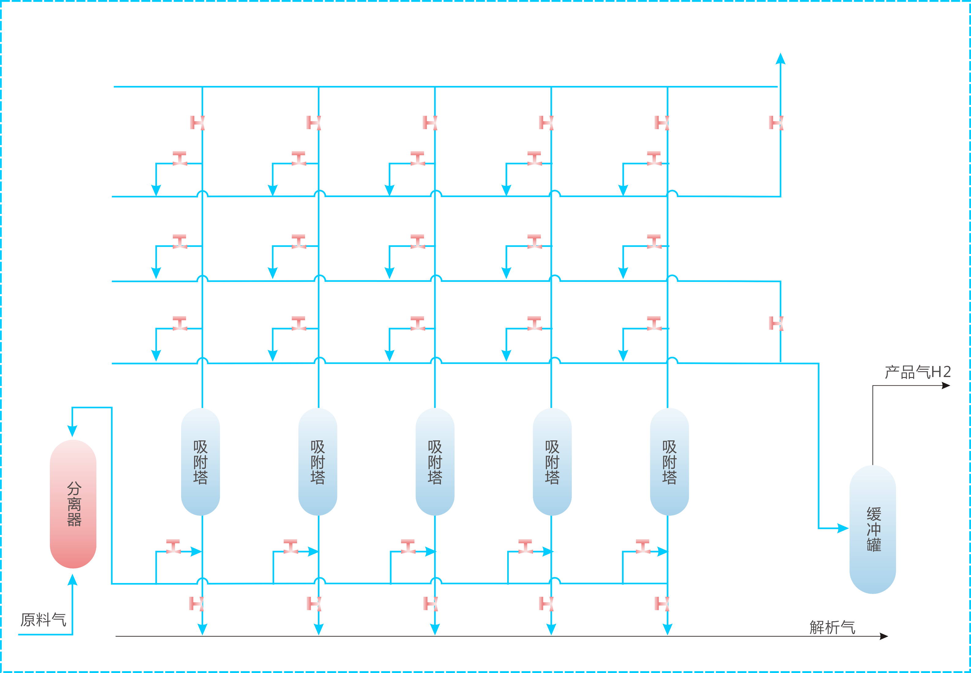 變壓吸附(Pressure Swing Adsorption.簡稱PSA)技術(shù),因高度自動化,操作簡單、環(huán)境良好,已廣泛應用于工業(yè)氣體分離領域。通過多年對變壓吸附的研究、試驗與運行,開發(fā)了各種富氫氣源中的氫氣提純成套技術(shù),為客戶提供裝置的升級改造服務。